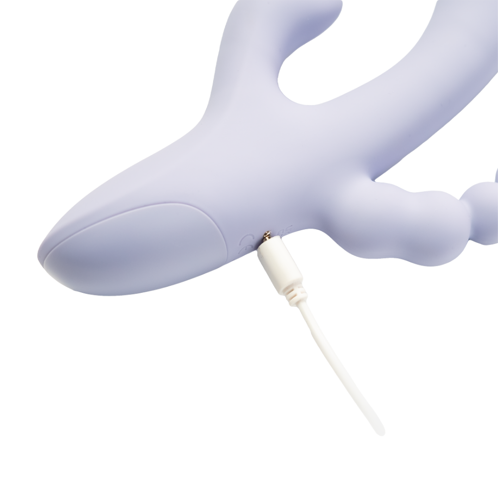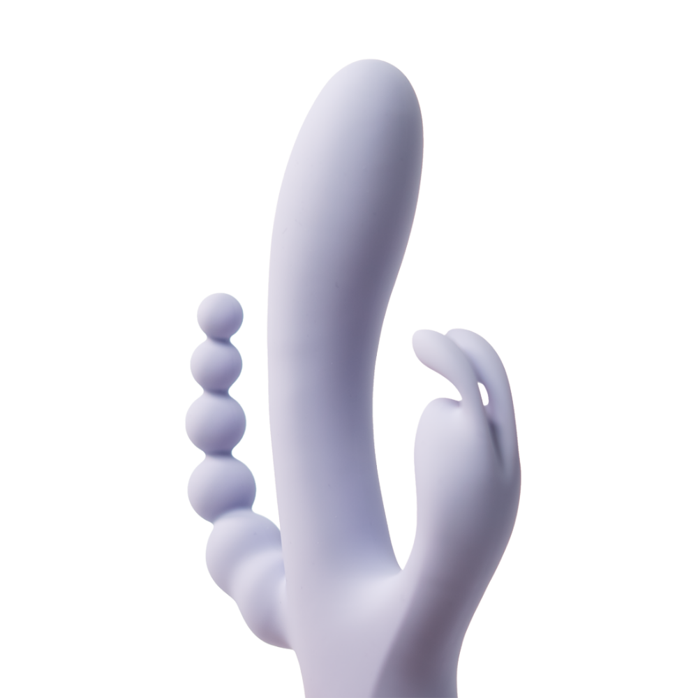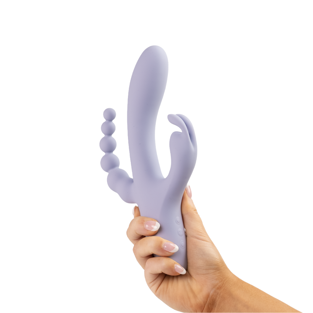 Triple The Fun is a 3-in-1 vibrator designed for layered pleasure and total control. Featuring a rabbit-eared clitoral teaser, a vibrating shaft, and a beaded anal stimulator, this versatile piece allows you to explore multiple sensations at once or focus on one area at a time. Each component operates independently, making it easy to customize intensity, rhythm, and combination play to suit your desires.